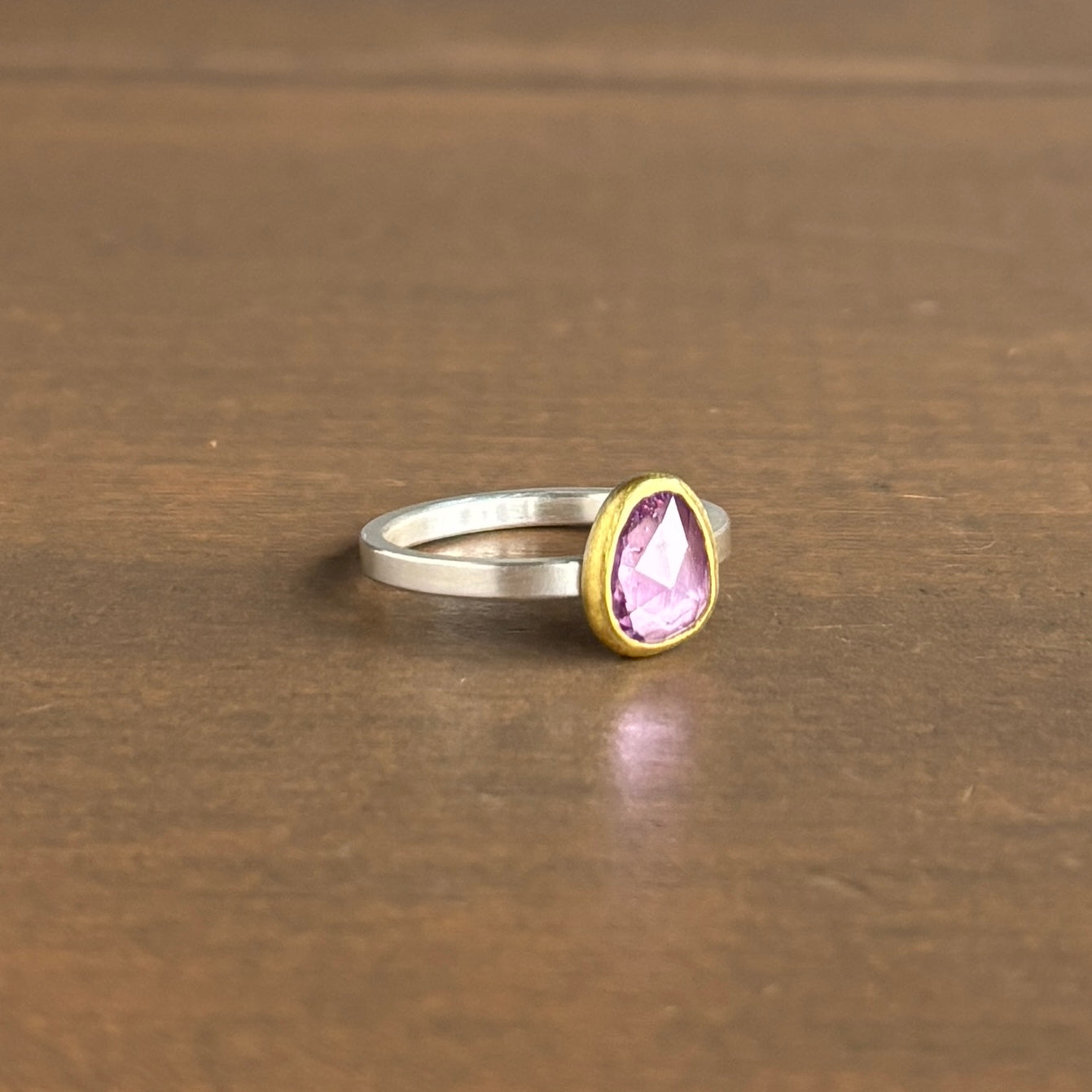 With a lifelong intrigue of gemstones and an interest in mathematics, Sam was lured into the metal arts. Learning to manipulate metal and work with stones has led his work into what it is today. He finds not only the amazing colors gems produce, but also their raw crystal structures, intriguing. The use of this and different color combinations of metal alloys lets him explore designs in shape as well as depths along another plane of vision.