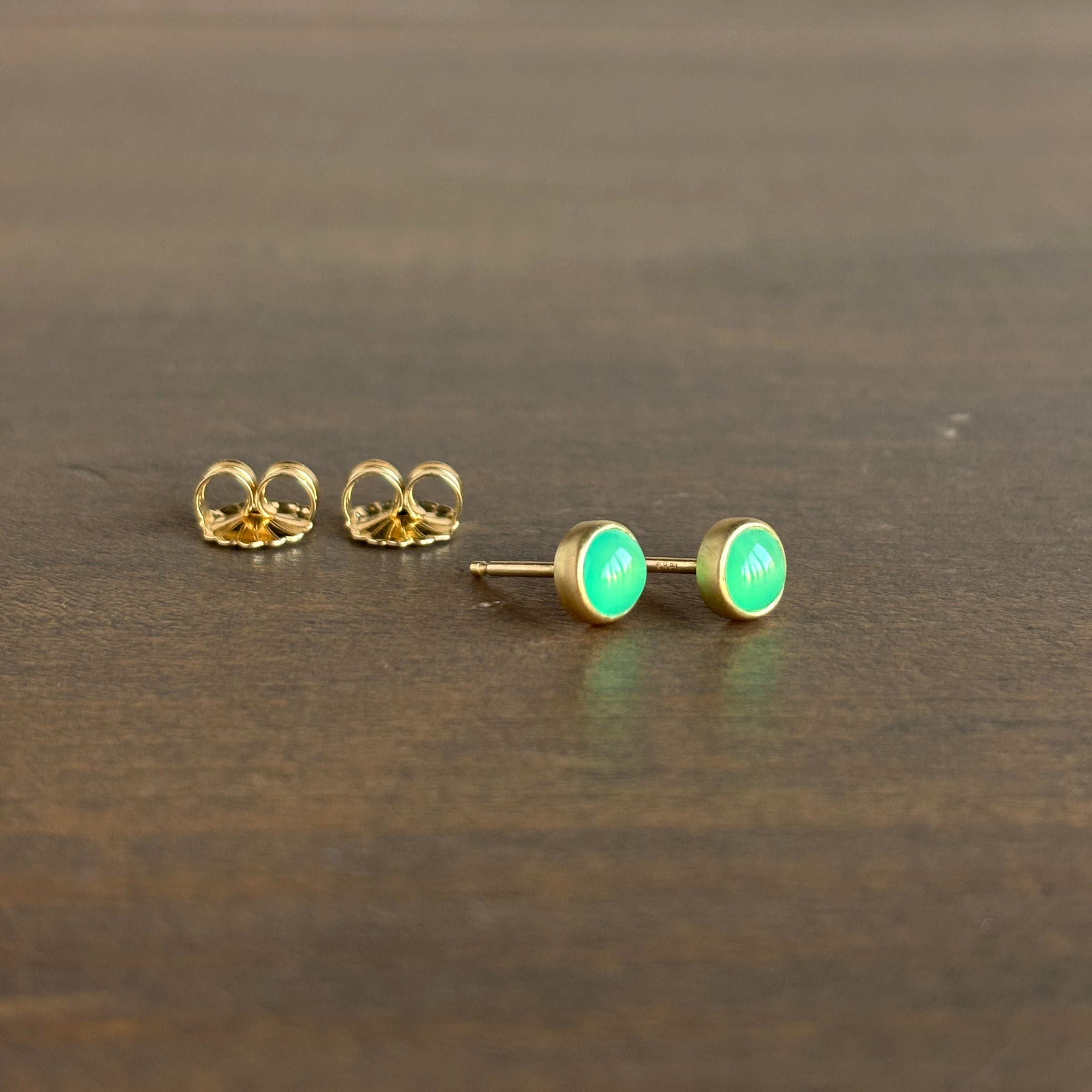 Minty, radiant chrysoprase burst with color from within snug gold bezels.