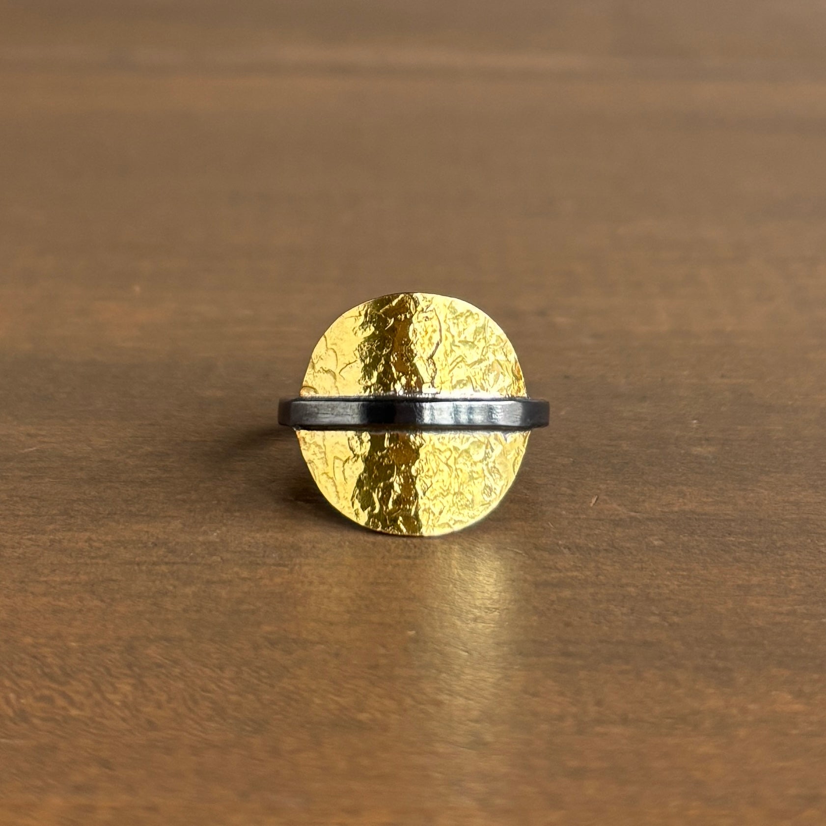 A beaming gold cigar-style ring that play with the dark and the light perfectly.