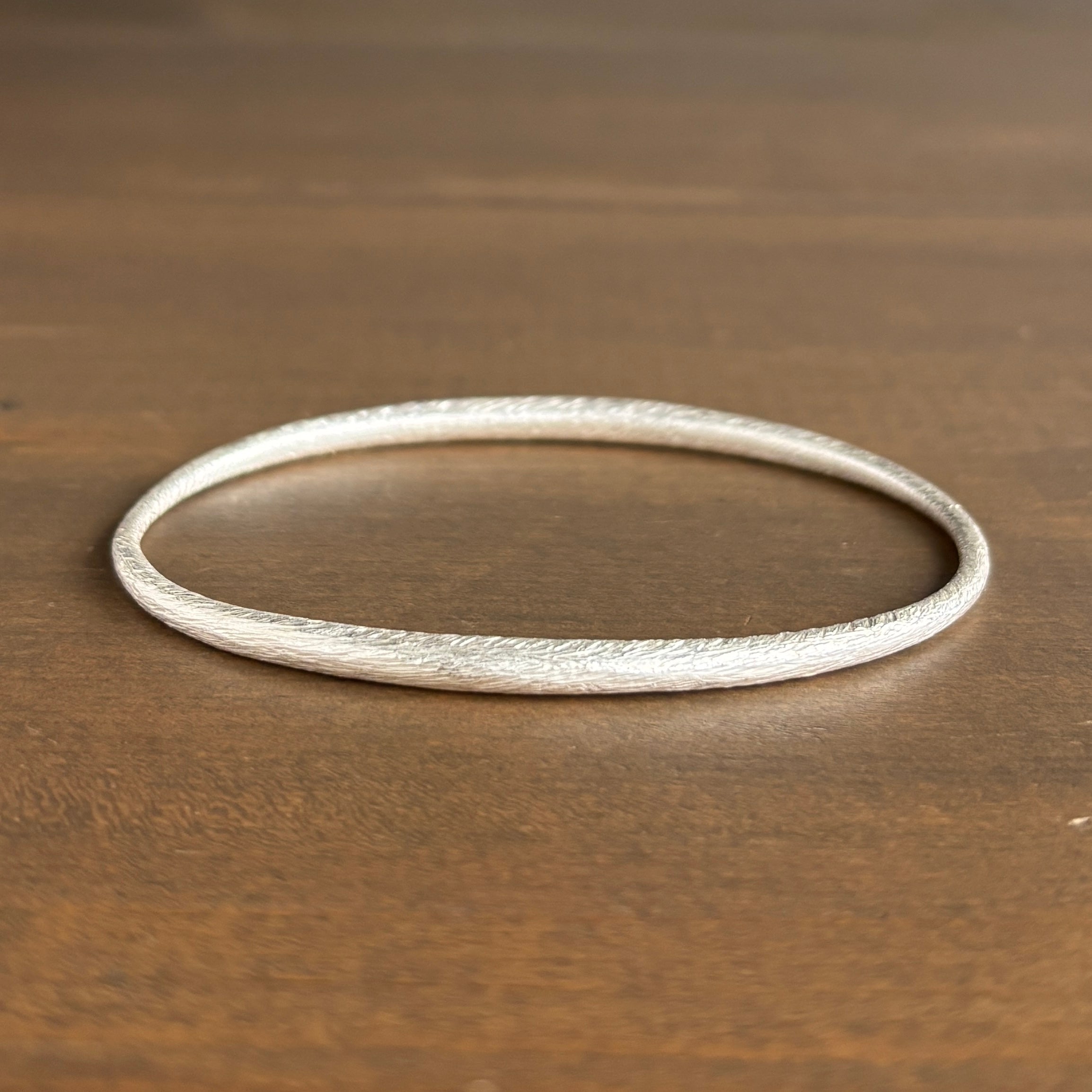 A hand-textured silver bangle with sculptural tapering for a touch of shine on the wrist.