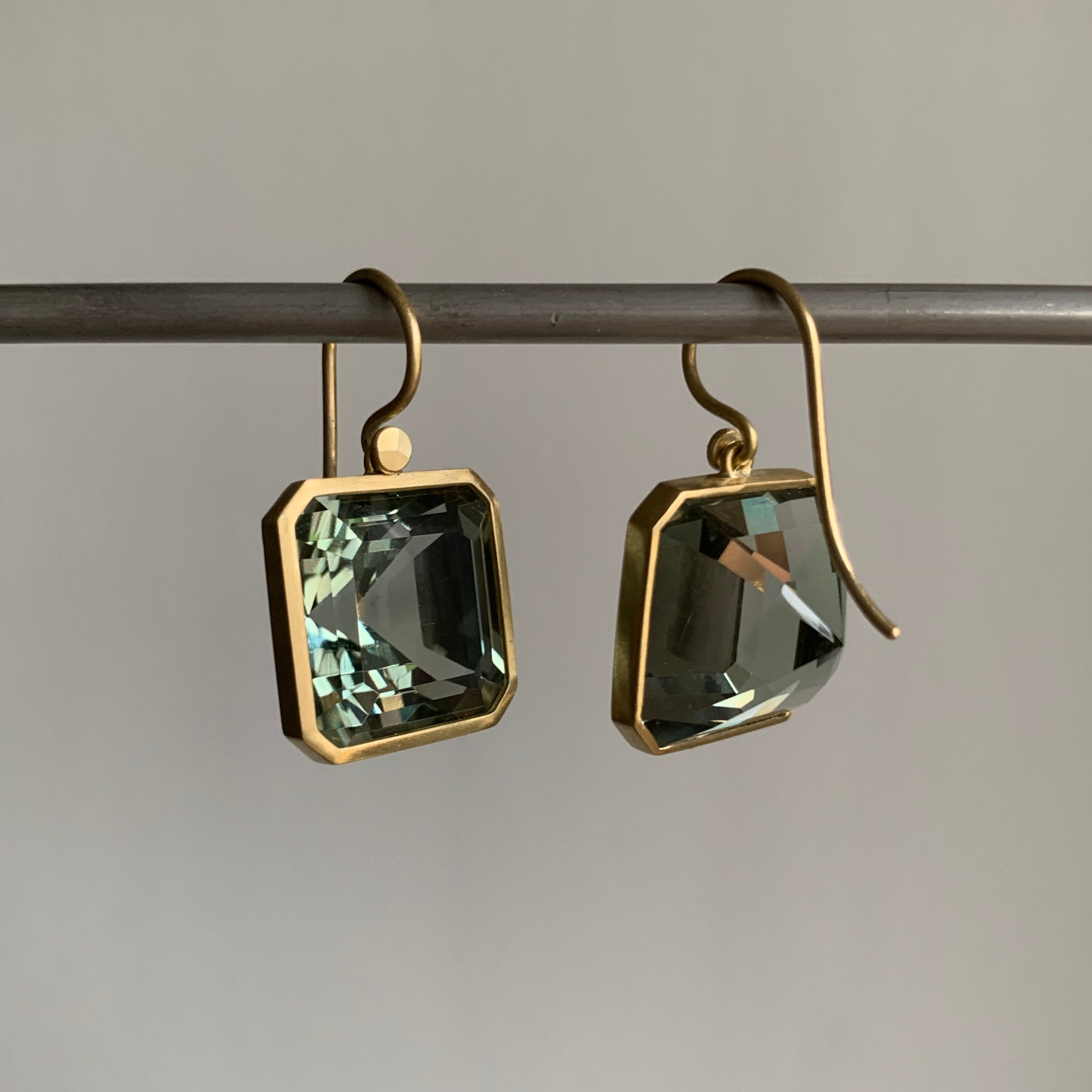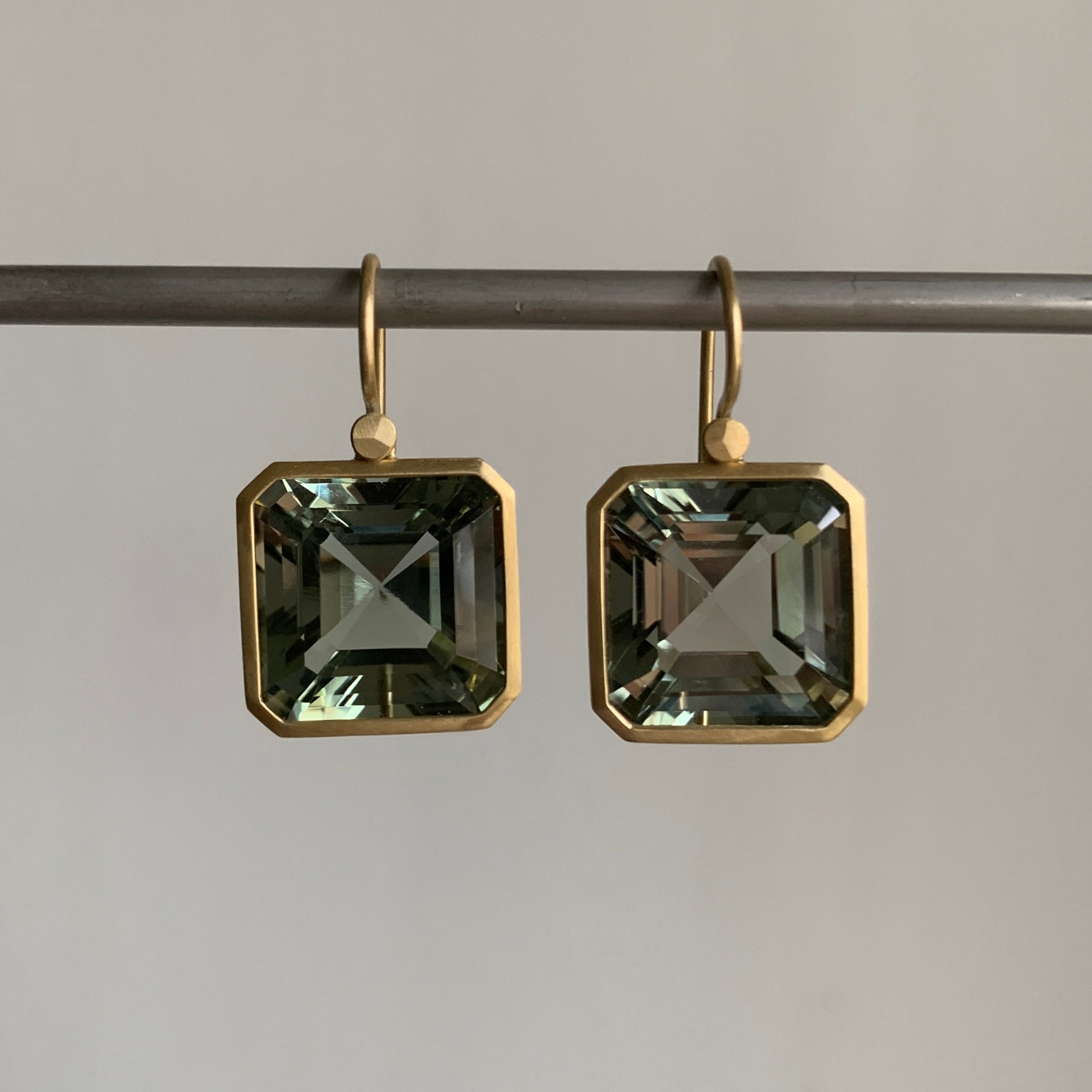 Dynamically faceted prasiolites create a phantasm of color in this elegant pair.