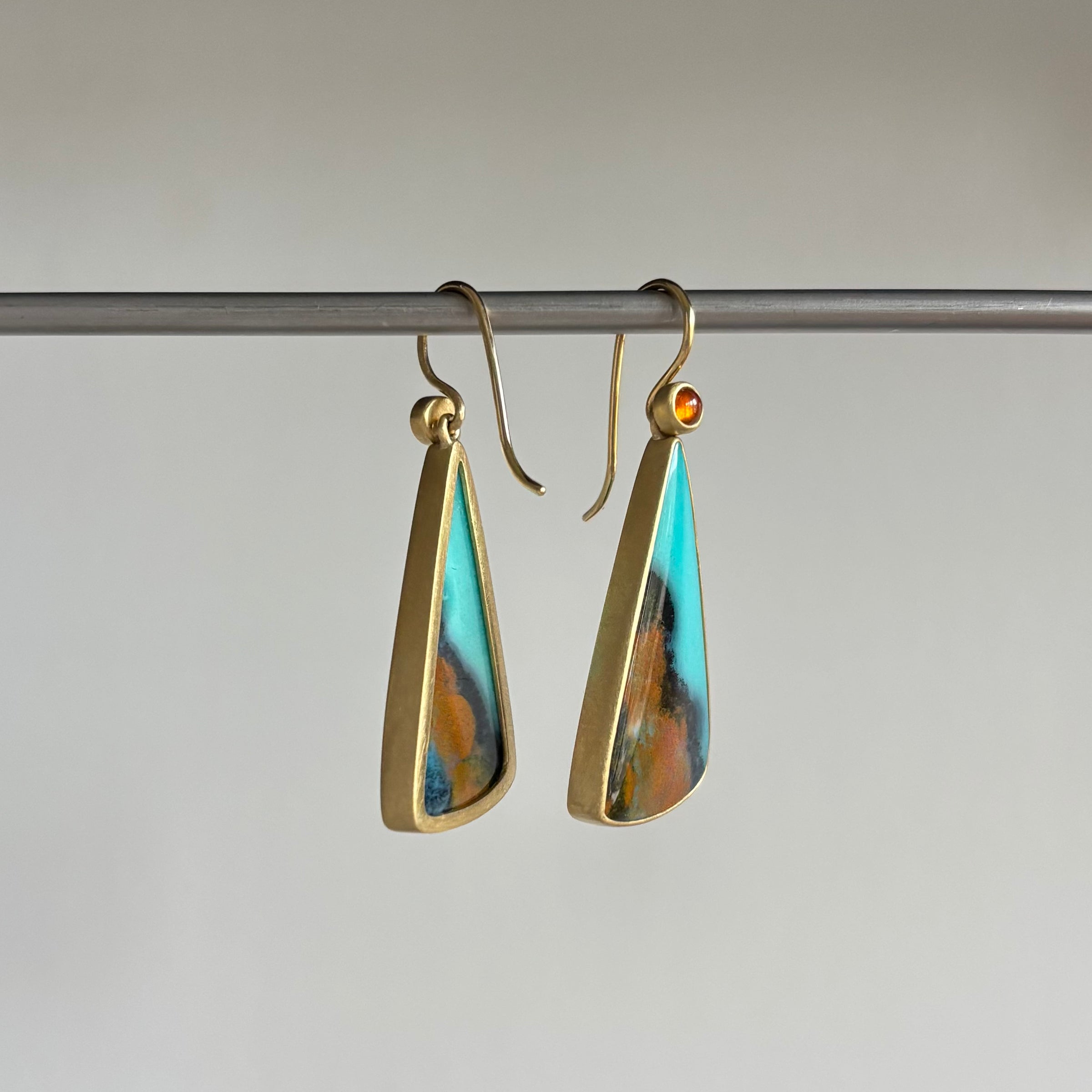 Striking chrysocolla triangles with plumed patterning hang from garnet-dimpled wires in this exceptional pair.