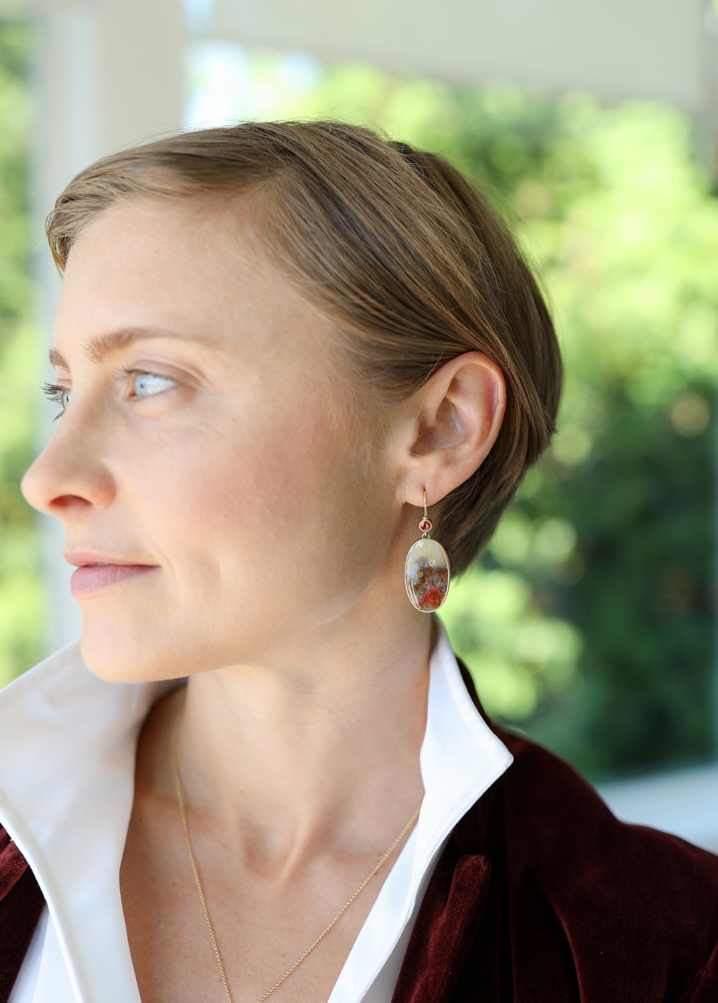 Reef-like billows surge within these picturesque agate earrings topped with fiery red sapphires: an underwater reverie.