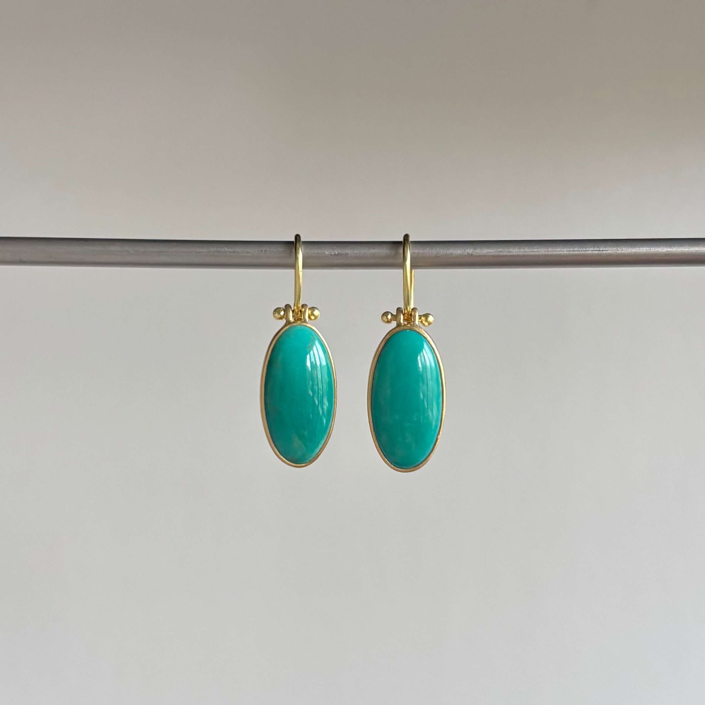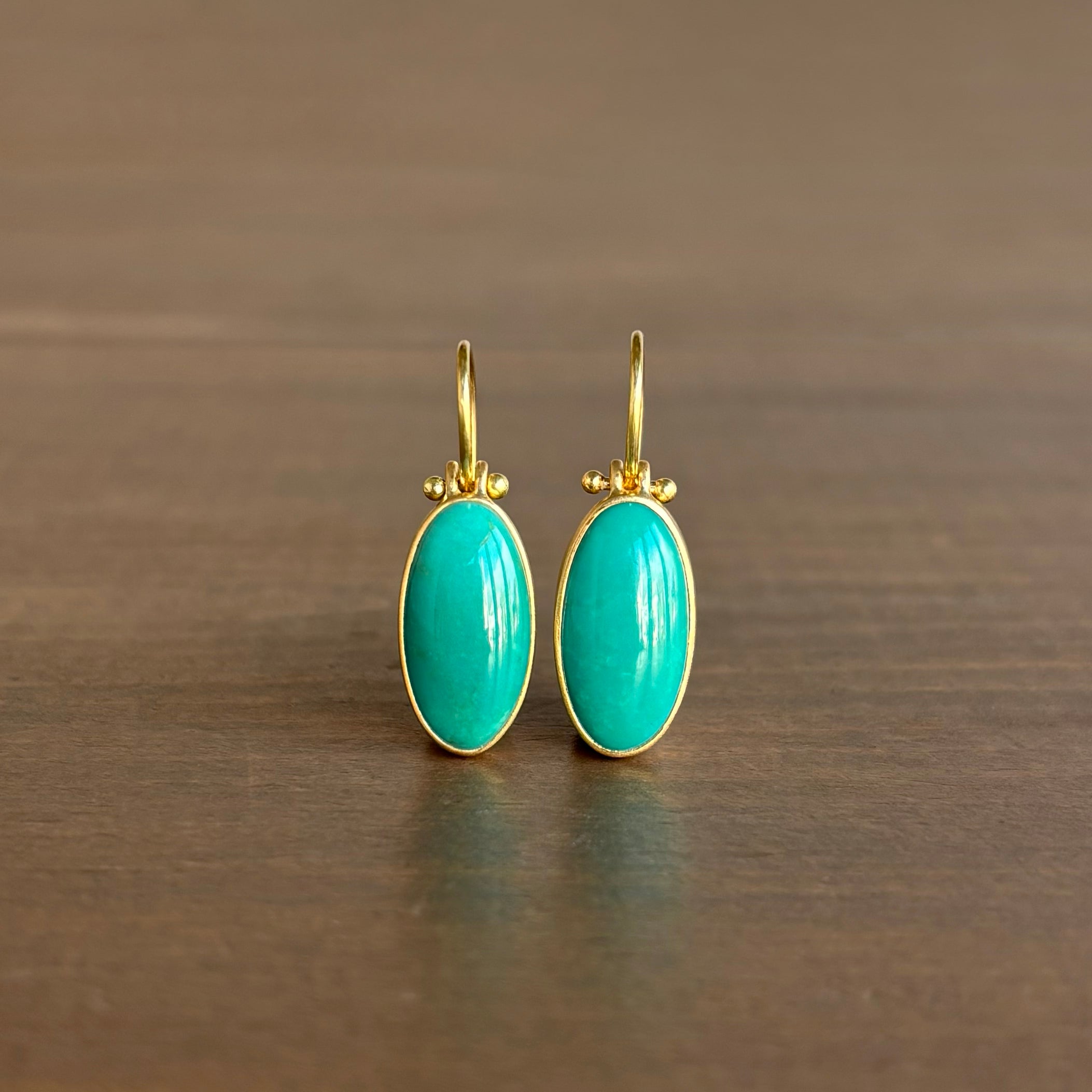 Exquisite ocean blue turquoise from Kingman, Arizona rest within golden bezels in these elegant, picturesque earrings.