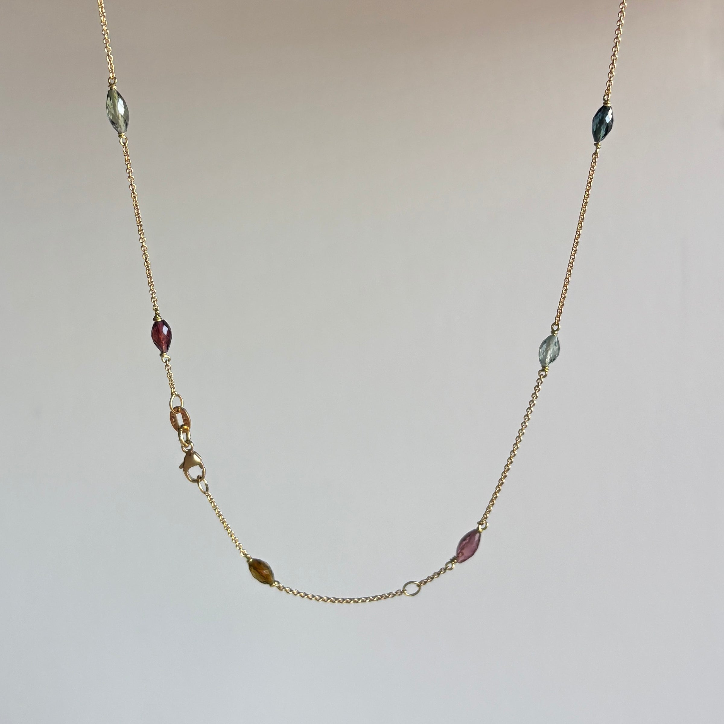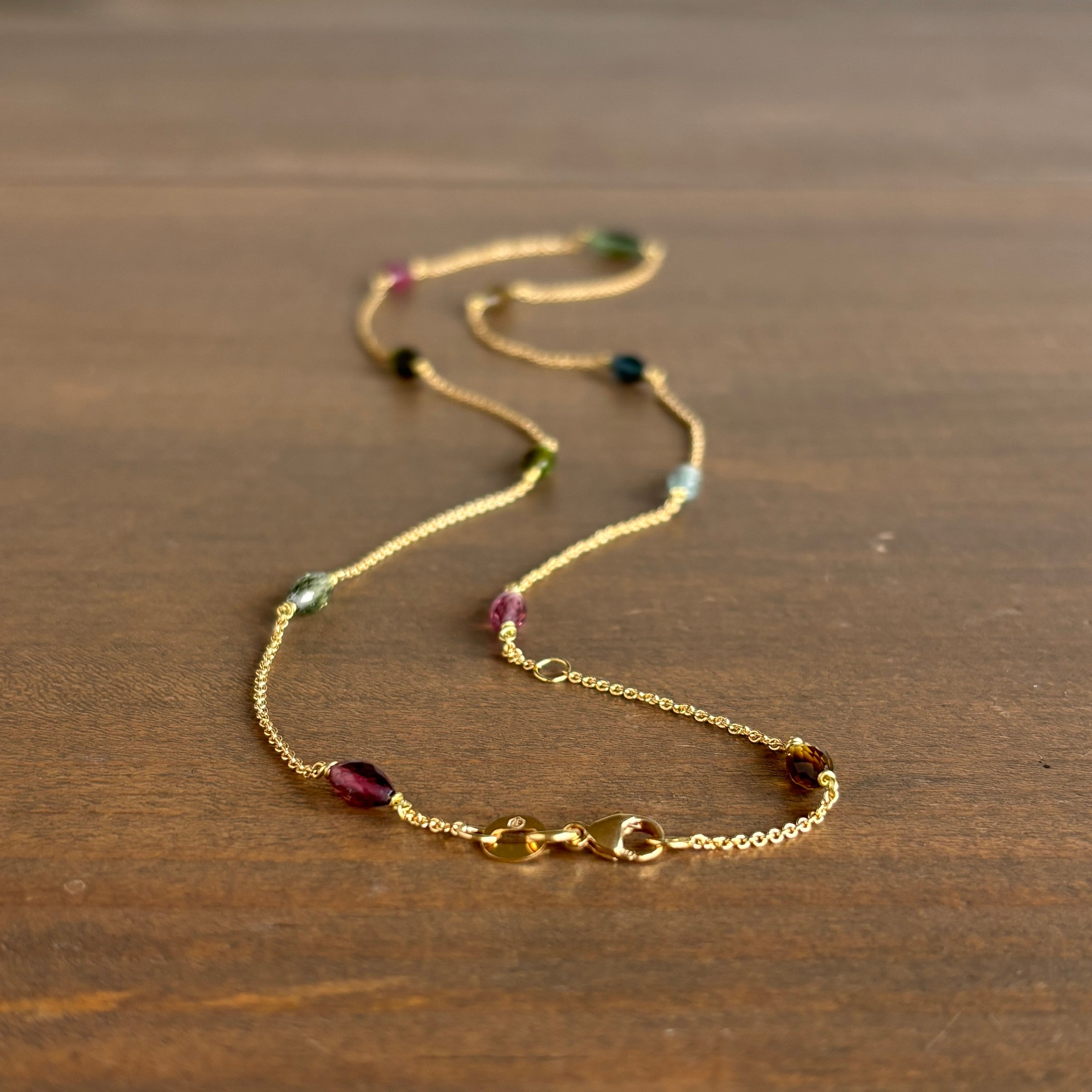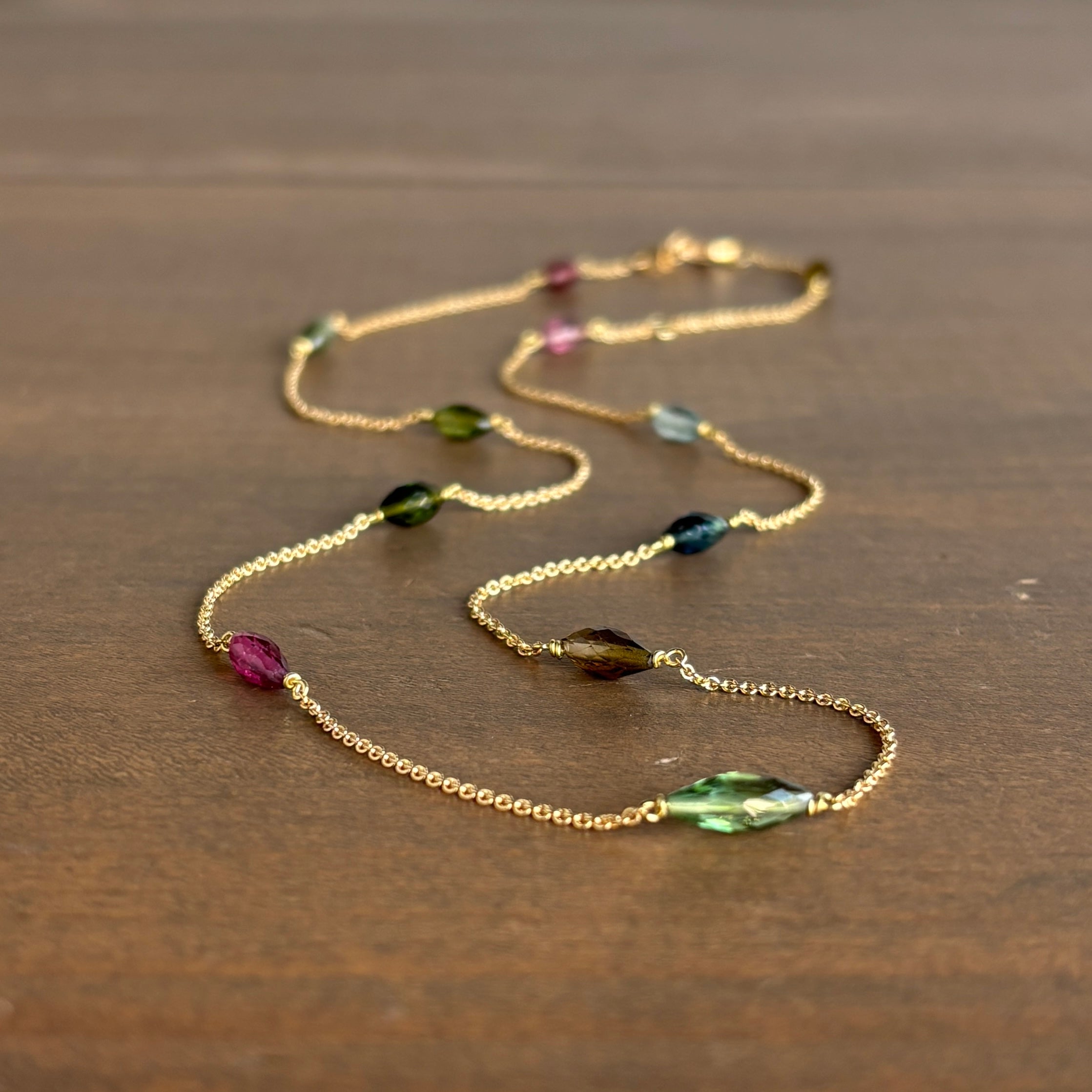 An elegant procession of shimmering tourmalines flow along a gold chain in this Victorian-inspired necklace.