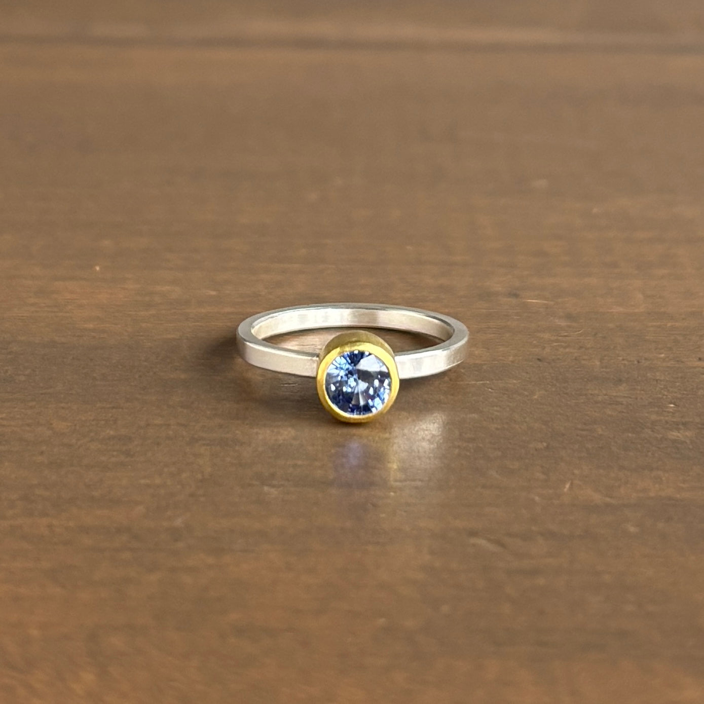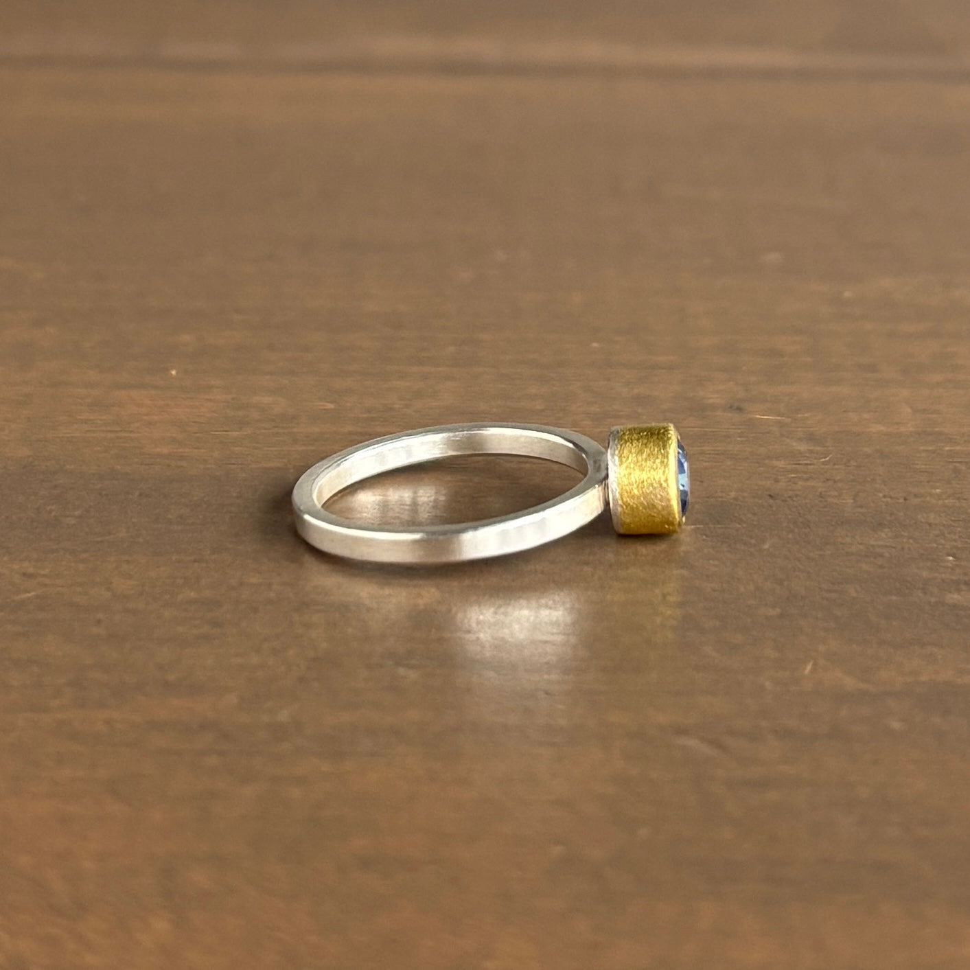 Electric periwinkle blues sparkle and shine from within a vibrant gold setting in this splendid stacking ring.