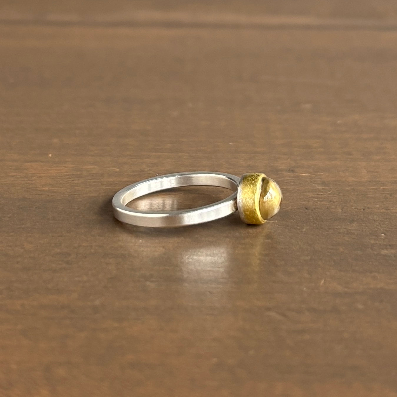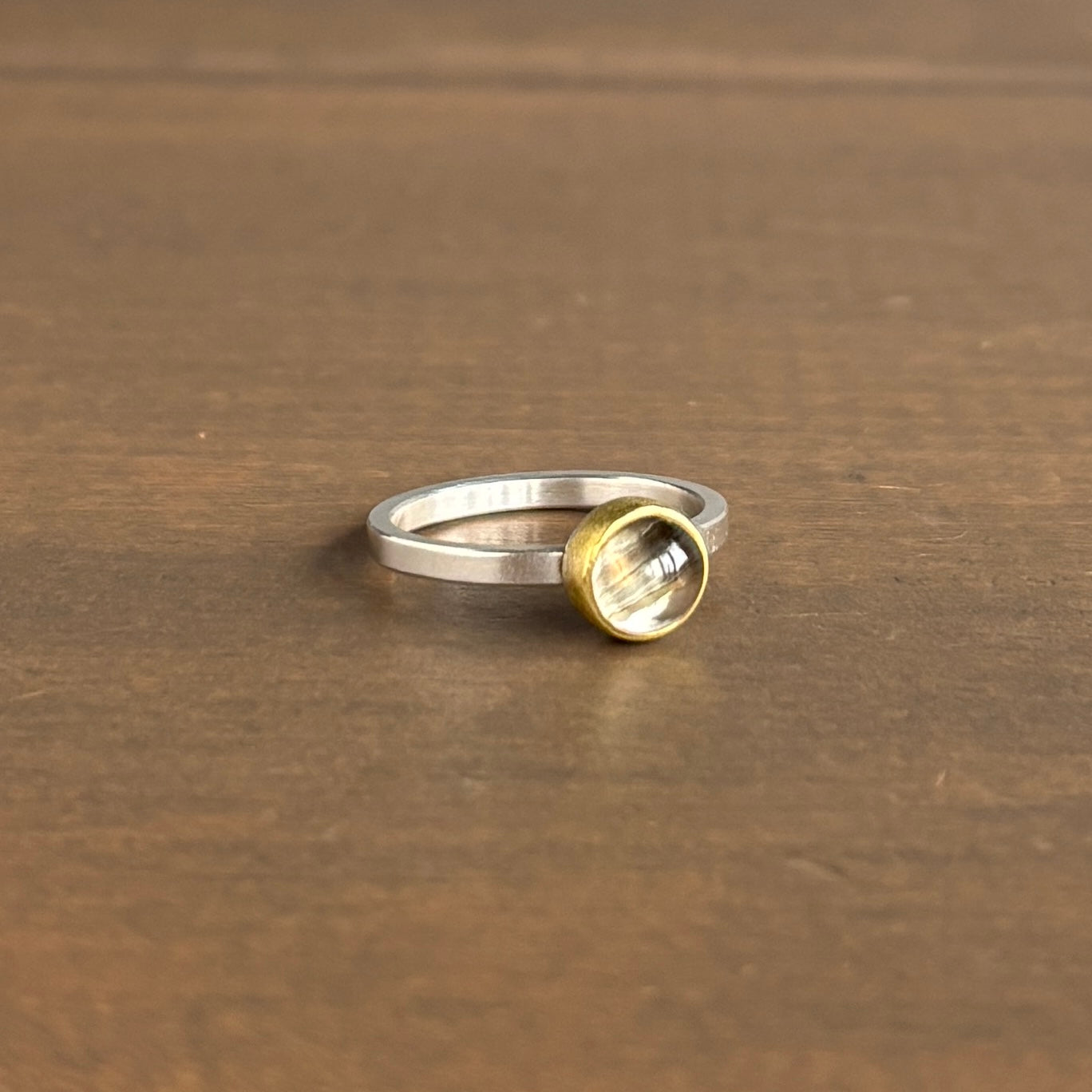 Somber tawny rutiles converge to form streaks within the margins of this enthralling quartz ring.