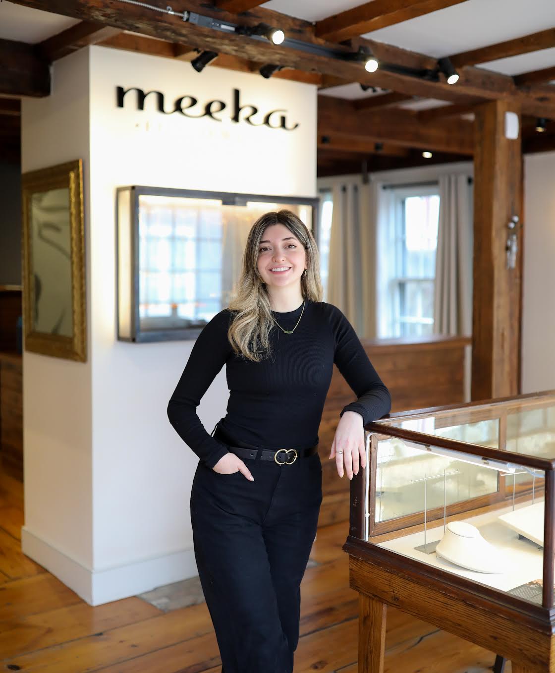 The inside is a great representation of owner Monika Krol's vision and aesthetic for Meeka: clean, curated, and warm. Custom and vintage cases are used throughout the space and provide the perfect backdrop to highlight the Meeka collection. Monika's studio is nestled in the back of the store and, if you visit in the summer, you might catch her "at the bench" – fabricating or carving a future heirloom.